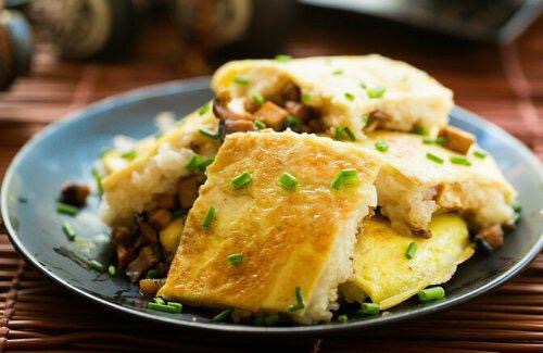 Dou Pi is a popular local dish with a filling of egg, rice, beef, mushrooms and beans cooked between two large round soybean skins and cut into pieces, structurally like a stuffed pizza without enclosing edges.